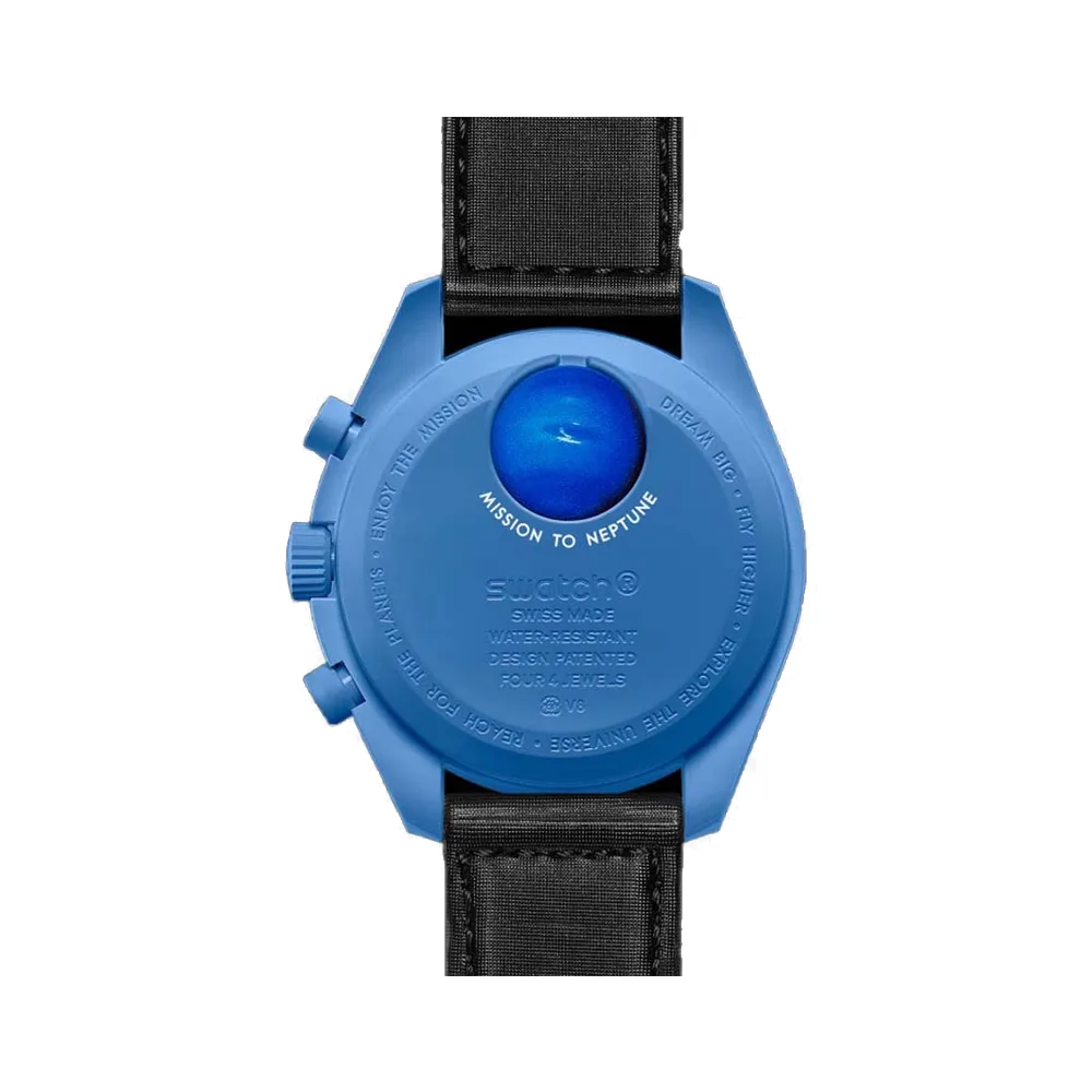 ساعت مچی امگا سواچ مدل “مأموریت به نپتون” (Mission to Neptune) یکی از محصولات جذاب این برند است که به عنوان یکی از مدلهای مشهور امگا شناخته میشود. این ساعت با ترکیبی از رنگهای آبی-سرمهای تیره و رنگ بند مشکی طراحی شده است. همچنین عقربههای ساعت، دقیقه و ثانیه شمار کرنوگراف و همچنین نشانگرهای ساعت از Super-LumiNova با رنگ سفید هستند تا در تاریکی درخشان دیده شوند و کنتراست بیشتری ایجاد کنند. این ساعت از موتور کوارتز برخوردار است و جنس قاب آن بایوسرامیک و جنس بند ولکرو (برزنتی) است. وزن این ساعت حدود 30 گرم است.