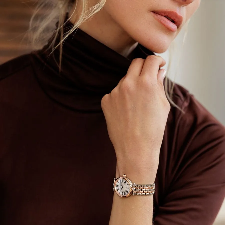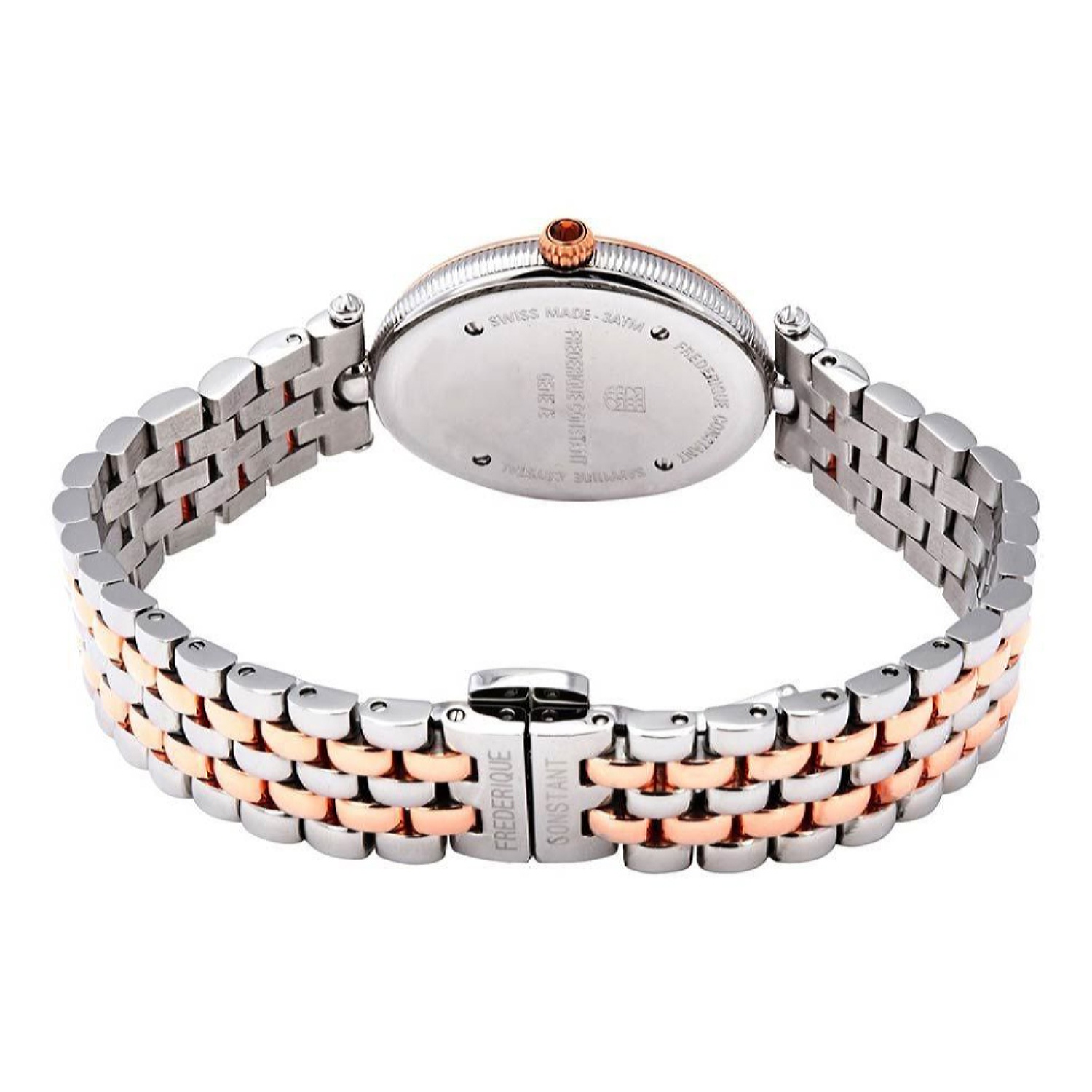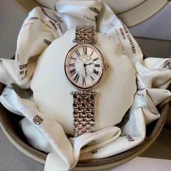 ساعت مچی زنانه فِرِدریک کنستانت مدل FC-200MPW2V2B به خاطر ظرافت و کیفیت متریال استفاده شده در طراحی کلی آن، سزاوار بررسی جز به جز ویژگی های به کار رفته در ظاهرش می باشد. اولین و مهم ترین چیزی که باید به آن اشاره کرد، رنگ بندی با کلاس سفید و استیل و مسی است و از خصوصیات کلی ظاهری آن نیز، صفحه بیضی چشم نواز می باشد. کمی با دقت تر که به صفحه این ساعت بنگریم، تنها عقربه ها دیده می شود که با ترکیب دلنشین کنار هم قرار گرفته اند و عقربه آنالوگ نقطه عطف این ترکیب می باشد. این محصول دارای ترکیب رنگی سفید - استیل - مسی است که مجموع این ها در کنار هم جلوه ی کلاسیک جذاب و خیره کننده به آن بخشیده است و استایل کلاسیک آن مناسب ست شدن با لباس مجلسی و کلاسیک است.