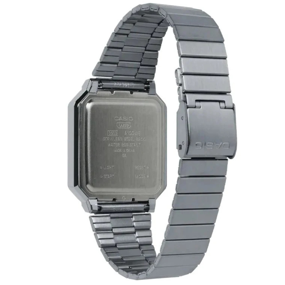 از نظر ظاهری ساعت مچی مردانه و زنانه کاسیو مدل A100WE-7BDF اولین ویژگی ظاهری این ساعت، هارمونی رنگی دوست داشتنی مشکی و استیل است. در کنار آن یکی دیگر از خاصیتهای ظاهری آن، صفحه چهارگوش خاص است. داخل صفحه اصلی، تقویم روزشمار و نمایشگر روزهای هفته قابل مشاهده است که با ترکیب هارمونیک کنار هم در یک صفحه قرار گرفته اند. این ساعت برای نمایش زمان از صفحه دیجیتال استفاده کرده و دارای ترکیب رنگی مشکی - استیل میباشد که جلوه ای کلاسیک اصولی و زیبا به این ساعت بخشیده است. در کل این ساعت دارای استایل کلاسیک بوده و بسیار مناسب ست شدن با لباس های مجلسی و کلاسیک میباشد.